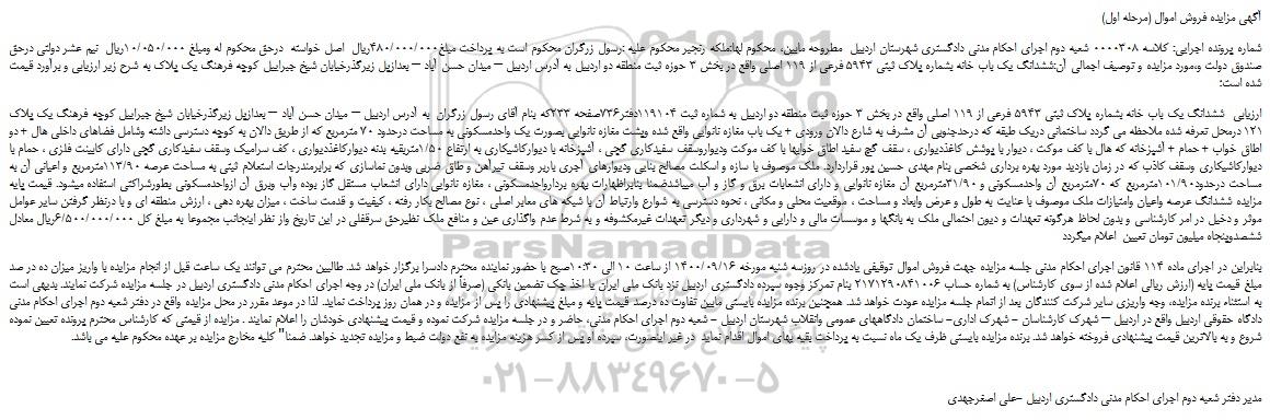 شماره پرونده اجرایی: کلاسه 0000308 شعبه دوم اجرای احکام مدنی دادگستری شهرستان اردبیل مطروحه مابین، محکوم لها:ملکه رنجبر محکوم علیه :رسول زرگران محکوم است به پرداخت مبلغ480/000/000ریال اصل خواسته درحق محکوم له ومبلغ 10/050/000ریال نیم عشر دولتی درحق صندوق دولت و،مورد مزایده و توصیف اجمالی آن:ششدانگ یک باب خانه بشماره پلاک ثبتی 5943 فرعی از 119 اصلی واقع در بخش 3 حوزه ثبت منطقه دو اردبیل به آدرس اردبیل – میدان حسن آباد – بعدازپل زیرگذرخیابان شیخ جبراییل کوچه فرهنگ یک پلاک به شرح زیر ارزیابی و برآورد قیمت شده است؛