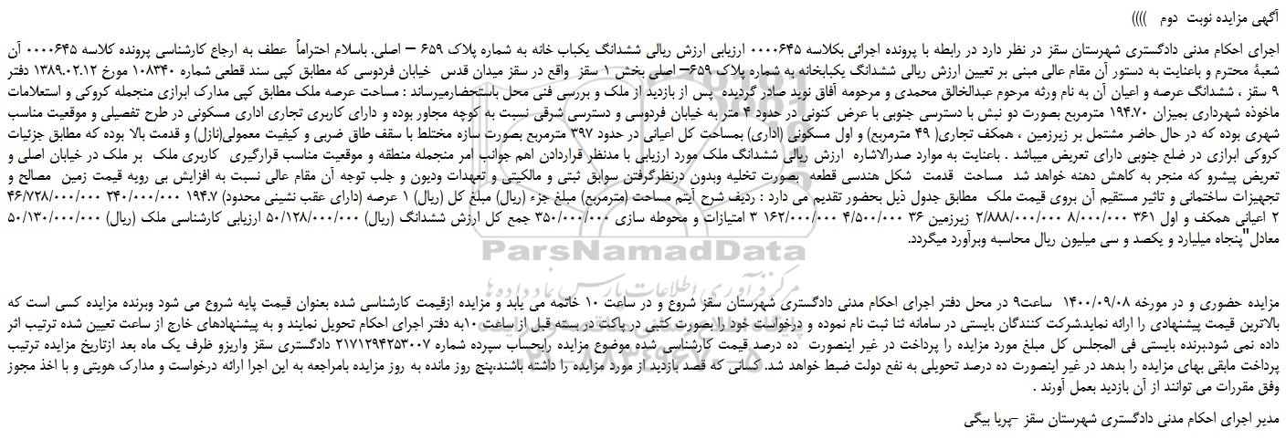 مزایده حضوری و در مورخه 1400/09/08 ساعت9 در محل دفتر اجرای احکام مدنی دادگستری شهرستان سقز شروع و در ساعت 10 خاتمه می یابد و مزایده ازقیمت کارشناسی شده بعنوان قیمت پایه شروع می شود وبرنده مزایده کسی است که بالاترین قیمت پیشنهادی را ارائه نماید.شرکت کنندگان بایستی در سامانه ثنا ثبت نام نموده و درخواست خود را بصورت کتبی در پاکت در بسته قبل از ساعت 10به دفتر اجرای احکام تحویل نمایند و به پیشنهادهای خارج از ساعت تعیین شده ترتیب اثر داده نمی شود.برنده بایستی فی المجلس کل مبلغ مورد مزایده را پرداخت در غیر اینصورت ده درصد قیمت کارشناسی شده موضوع مزایده رابحساب سپرده شماره 2171294253007 دادگستری سقز واریزو ظرف یک ماه بعد ازتاریخ مزایده ترتیب پرداخت مابقی بهای مزایده را بدهد در غیر اینصورت ده درصد تحویلی به نفع دولت ضبط خواهد شد. کسانی که قصد بازدید از مورد مزایده را داشته باشند،پنج روز مانده به روز مزایده بامراجعه به این اجرا ارائه درخواست و مدارک هویتی و با اخذ مجوز وفق مقررات می توانند از آن بازدید بعمل آورند .