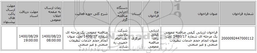 مناقصه، فراخوان ارزیابی کیفی مناقصه عمومی یک مرحله ای شماره 1400/17 تحت عنوان انجام حجم خدمات تنظیفات صنعتی و غیر صنعتی, فراخوان ارزیابی کیفی مناقصه عمومی یک مرحله ای شماره 1400/17 تحت عنوان انجام حجم خدمات تنظیفات صنعتی و غیر صنعتی