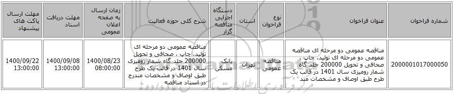 2000001017000050مناقصه عمومی دو مرحله ای مناقصه عمومی دو مرحله ای تولید، چاپ ، صحافی و تحویل 200000 جلد گاه شمار رومیزی سال 1401 در قالب یک طرح طبق اوصاف و مشخصات مندمناقصه عمومیتهرانبانک مسکنمناقصه عمومی دو مرحله ای تولید، چاپ ، صحافی و تحویل 200000 جلد گاه شمار رومیزی سال 1401 در قالب یک طرح طبق اوصاف و مشخصات مندرج در اسناد مناقصه 1400/08/23 08:00:001400/09/08 13:00:001400/09/22 13:00:00