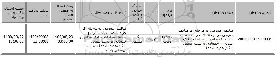 2000001017000049 | مناقصه عمومی دو مرحله ای مناقصه عمومی دو مرحله ای خرید ، نصب ، راه اندازی و آموزش سامانه اطلاع رسانی و خدماتی بر بستر موبایل بانک(تجدید شده) | مناقصه عمومی | تهران | بانک مسکن | مناقصه عمومی دو مرحله ای خرید ، نصب ، راه اندازی و آموزش سامانه اطلاع رسانی و خدماتی بر بستر موبایل بانک(تجدید شده) طبق اسناد پیوستی بانک | 1400/08/23 08:00:00 | 1400/09/08 13:00:00 | 1400/09/22 13:00:00 |