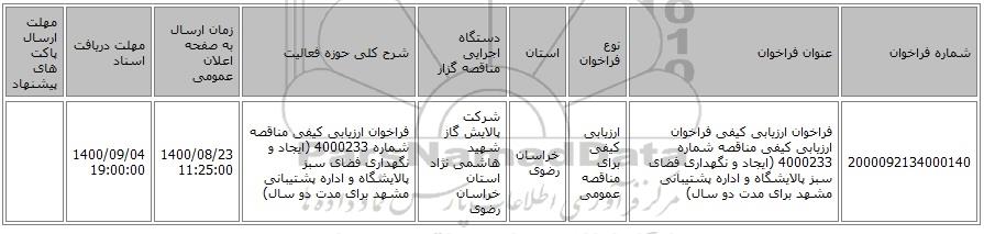 | 2000092134000140 | فراخوان ارزیابی کیفی فراخوان ارزیابی کیفی مناقصه شماره 4000233 (ایجاد و نگهداری فضای سبز پالایشگاه و اداره پشتیبانی مشهد برای مدت دو سال) | ارزیابی کیفی برای مناقصه عمومی | خراسان رضوی | شرکت پالایش گاز شهید هاشمی نژاد استان خراسان رضوی | فراخوان ارزیابی کیفی مناقصه شماره 4000233 (ایجاد و نگهداری فضای سبز پالایشگاه و اداره پشتیبانی مشهد برای مدت دو سال) | 1400/08/23 11:25:00 | 1400/09/04 19:00:00 |