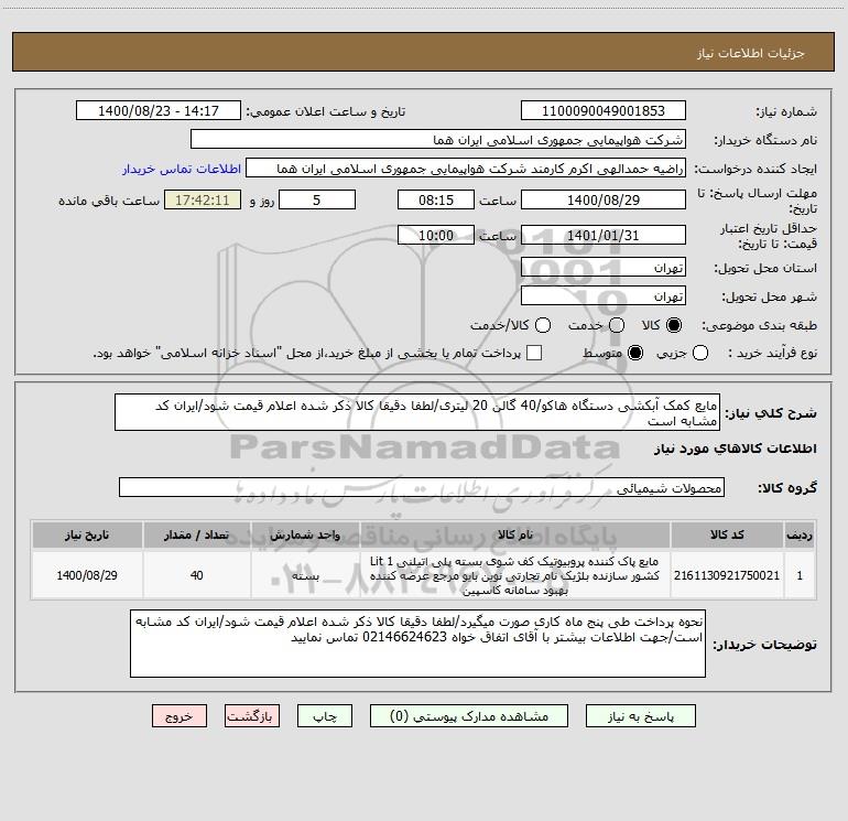 شرح کلی نیاز: مایع کمک آبکشی دستگاه هاکو/40 گالن 20 لیتری/لطفا دقیقا کالا ذکر شده اعلام قیمت شود/ایران کد مشابه است