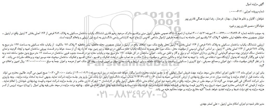 ،به موجب دادنامه شماره 140007390001483606مورخه1400/05/31صادره از شعبه 5 دادگاه عمومی حقوقی اردبیل مبنی برتقسیم ماترک مرحوم رحیم قادری ششدانگ یکباب ساختمان مسکونی به پلاک 289 فرعی از 126 اصلی بخش 3 اردبیل واقع در اردبیل ، خیابان جمهوری محله حافظیه نبش حافظیه 4 پلاک 97 وتقسیم ثمن حاصله به نسبت حصه طرفین ازاموال مشاعی که پس ازارجاع امربه کارشناس رسمی دادگستری به شرح ذیل ارزیابی و واعلام گردیده است.
