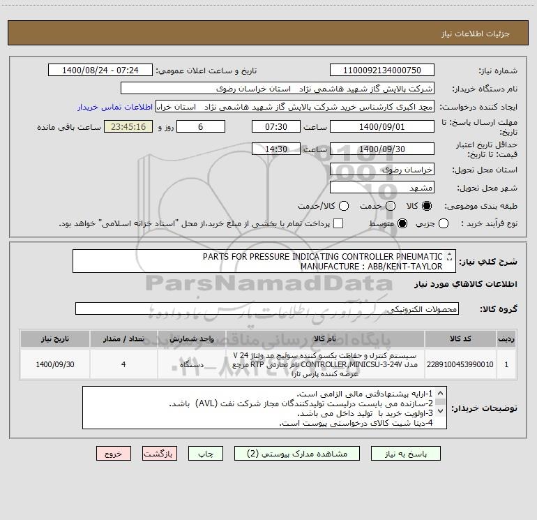 نام دستگاه خریدار:شرکت پالایش گاز شهید هاشمی نژاد استان خراسان رضوی