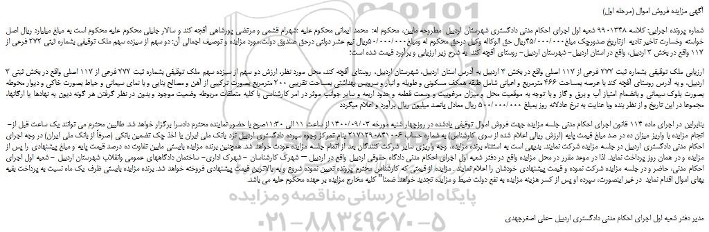 شماره پرونده اجرایی: کلاسه 9901348 شعبه اول اجرای احکام مدنی دادگستری شهرستان اردبیل مطروحه مابین، محکوم له: محمد ایمانی محکوم علیه :شهرام قشمی و مرتضی پورشاهی آقجه کند و سالار جلیلی محکوم علیه محکوم است به مبلغ میلیارد ریال اصل خواسته وخسارت تاخیر تادیه ازتاریخ صدورچک مبلغ45/000/000ریال حق الوکاله وکیل درحق محکوم له ومبلغ50/000/000ریال نیم عشر دولتی درحق صندوق دولت،مورد مزایده و توصیف اجمالی آن: دو سهم از سیزده سهم ملک توقیفی بشماره ثبتی 272 فرعی از 117 واقع در بخش 3 اردبیل، واقع در استان اردبیل- شهرستان اردبیل- روستای آقچه کند به شرح زیر ارزیابی و برآورد قیمت شده است؛