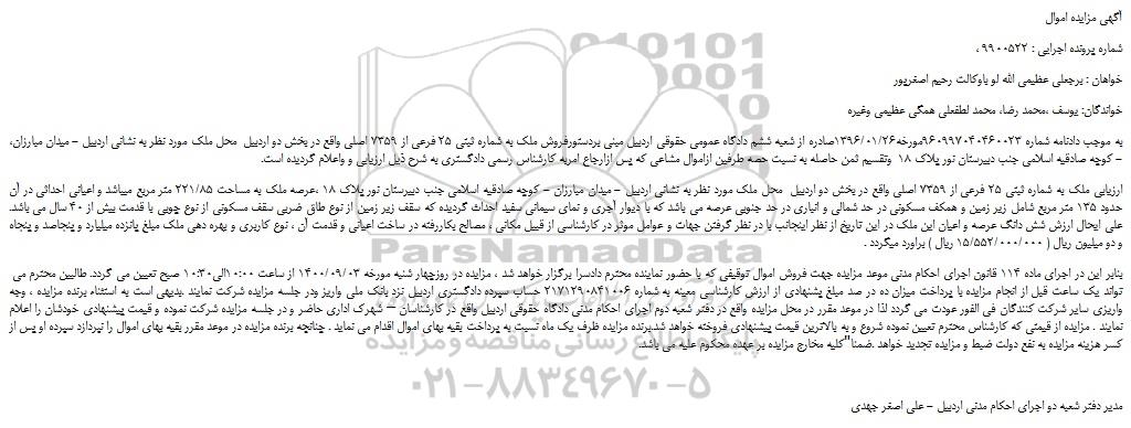 ،به موجب دادنامه شماره 960997040460023مورخه1396/01/26صادره از شعبه ششم دادگاه عمومی حقوقی اردبیل مبنی بردستورفروش ملک به شماره ثبتی 25 فرعی از 7359 اصلی واقع در بخش دو اردبیل محل ملک مورد نظر به نشانی اردبیل - میدان مبارزان - کوچه صادقیه اسلامی جنب دبیرستان نور پلاک 18 وتقسیم ثمن حاصله به نسبت حصه طرفین ازاموال مشاعی که پس ازارجاع امربه کارشناس رسمی دادگستری به شرح ذیل ارزیابی و واعلام گردیده است.