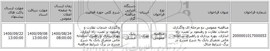 مناقصه، مناقصه عمومی دو مرحله ای واگذاری خدمات نظارت و رهنمود بر نصب، راه اندازی، بهره برداری و راهبری سامانه مالی متمرکز بانک به شرح ‏مندرج در برگ شرایط مناق از کلیه افراد متخصص و شرکت‌ها واجد شرایط دعوت به عمل می‌آید در مناقصه با کد خبرگزاری پارس نماد: 3953618 شرکت نمایند. این مناقصه در تاریخ 1400/08/24 شروع و مهلت آن تا تاریخ 1400/09/08 میباشد.