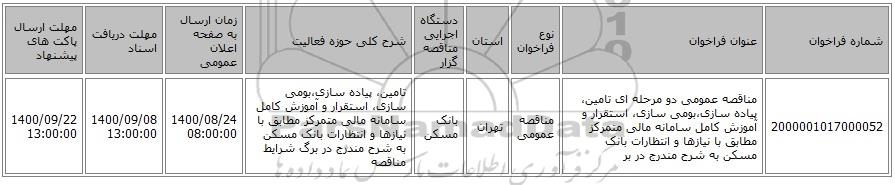 مناقصه، مناقصه عمومی دو مرحله ای تامین، پیاده سازی،بومی سازی، استقرار و آموزش کامل سامانه مالی متمرکز مطابق با نیازها و انتظارات بانک ‏مسکن به شرح مندرج در بر از کلیه افراد متخصص و شرکت‌ها واجد شرایط دعوت به عمل می‌آید در مناقصه با کد خبرگزاری پارس نماد: 3953621 شرکت نمایند. این مناقصه در تاریخ 1400/08/24 شروع و مهلت آن تا تاریخ 1400/09/08 میباشد.