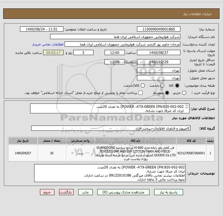شرح کلی نیاز: POWER -ATX-GREEN (PN:920-002-002) به تعداد 20عدد.
