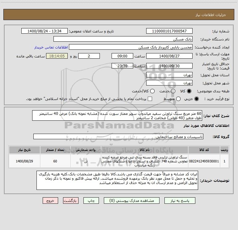 شرح کلی نیاز: 60 متر مربع سنگ تراورتن سفید میاندوآب سوپر ممتاز سورت شده (مشابه نمونه بانک) عرض 40 سانتیمتر طول متغیر (40 طولی) ضخامت 2 سانتیمتر