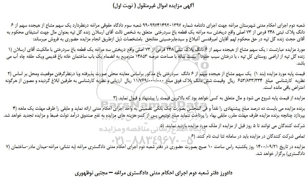 شعبه دوم اجرای احکام مدنی شهرستان مراغه جهت اجرای دادنامه شماره 9909974149201397 شعبه سوم دادگاه حقوقی مراغه درنظردارد یک سهم مشاع از هیجده سهم از 6 دانگ پلاک ثبتی 248 فرعی از 73 اصلی واقع دربخش سه مراغه یک قطعه باغ سردرختی  متعلق به شخص ثالث آقای ارسلان زنده گل تپه بعنوان مال جهت استیفای محکوم به آقای حجت زنده گل تپه در حق محکوم لهم آقایان امیرقدسی آغبلاغ و سیدجابرحسینی مغانجق  بامشخصات ذیل ازطریق انجام مزایده حضوری به فروش میرساند: