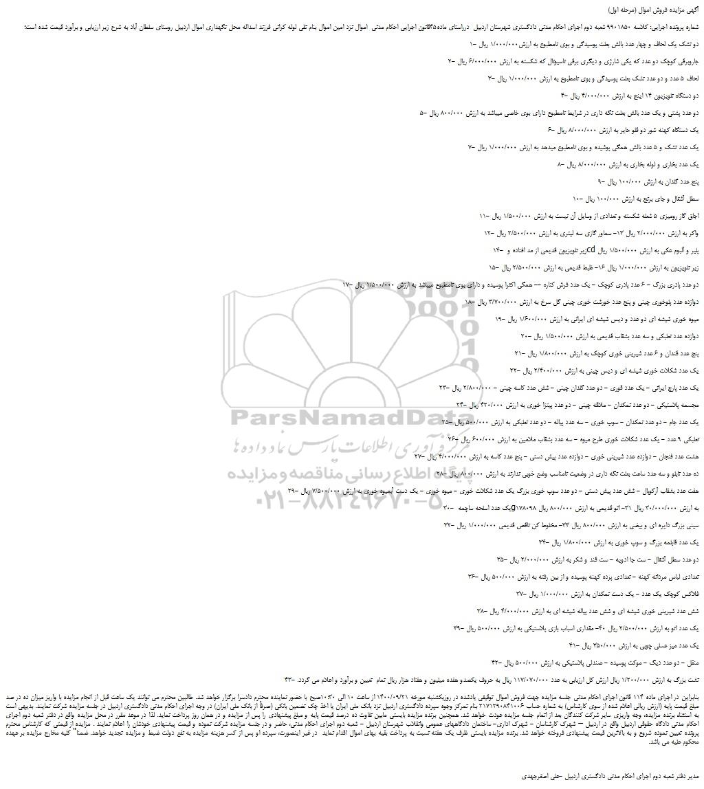 بنابراین در اجرای ماده 114 قانون اجرای احکام مدنی جلسه مزایده جهت فروش اموال توقیفی یادشده در روزیکشنبه مورخه 1400/09/21 از ساعت 10 الی 10:30صبح با حضور نماینده محترم دادسرا برگزار خواهد شد. طالبین محترم می توانند یک ساعت قبل از انجام مزایده با واریز میزان ده در صد مبلغ قیمت پایه (ارزش ریالی اعلام شده از سوی کارشناس) به شماره حساب 2171290841006 بنام تمرکز وجوه سپرده دادگستری اردبیل نزد بانک ملی ایران یا اخذ چک تضمین بانکی (صرفاً از بانک ملی ایران) در وجه اجرای احکام مدنی دادگستری اردبیل در جلسه مزایده شرکت نمایند. بدیهی است به استثناء برنده مزایده، وجه واریزی سایر شرکت کنندگان بعد از اتمام جلسه مزایده عودت خواهد شد. همچنین برنده مزایده بایستی مابین تفاوت ده درصد قیمت پایه و مبلغ پیشنهادی را پس از مزایده و در همان روز پرداخت نماید. لذا در موعد مقرر در محل مزایده واقع در دفتر شعبه دوم اجرای احکام مدنی دادگاه حقوقی اردبیل واقع در اردبیل – شهرک کارشناسان - شهرک اداری- ساختمان دادگاههای عمومی وانقلاب شهرستان اردبیل - شعبه دوم اجرای احکام مدنی، حاضر و در جلسه مزایده شرکت نموده و قیمت پیشنهادی خودشان را اعلام نمایند . مزایده از قیمتی که کارشناس محترم پرونده تعیین نموده شروع و به بالاترین قیمت پیشنهادی فروخته خواهد شد. برنده مزایده بایستی ظرف یک هفته نسبت به پرداخت بقیه بهای اموال اقدام نماید در غیر اینصورت، سپرده او پس از کسر هزینه مزایده به نفع دولت ضبط و مزایده تجدید خواهد. ضمنا" کلیه مخارج مزایده بر عهده محکوم علیه می باشد.