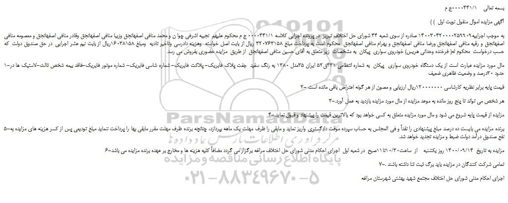 به موجب اجراییه140030420000259909 صادره از سوی شعبه 44 شورای حل اختلاف تبریز در پرونده اجرایی کلاسه 0000441/1 ج م محکوم علیهم نجیبه اشرفی چوا ن و محمد منافی اصفهانجق وزیبا منافی اصفهانجق وقادر منافی اصفهانجق و معصومه منافی اصفهانجق و رقیه منافی اصفهانجق ورضا منافی اصفهانجق و بهرام منافی اصفهانجق محکوم است به پرداخت مبلغ 320763158 ریال از بابت اصل خواسته وهزینه دادرسی وتاخیر تادیه ومبلغ 16038158ریال از بابت نیم عشر اجرایی در حق صندوق دولت که حسب درخواست محکوم له( فرخنده وحدانی هریس) خودروی سواری پیکان به مشخصات زیر متعلق به آقای حسین منافی اصفهانجق از طریق مزایده حضوری بفروش می رسد