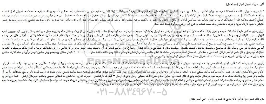 شماره پرونده اجرایی: کلاسه 960528 شعبه دوم اجرای احکام مدنی دادگستری شهرستان اردبیل مطروحه مابین، محکوم لها:خانم رقیه شاهی باوکالت ژیلا کاظمی محکوم علیه :بیت الله مطلب زاده محکوم است به پرداخت مبلغ1/000/000/000ریال اصل خواسته ومبلغ25/200/000ریال هزینه دادرسی ومبلغ6/480/000ریال حق الوکاله وکیل وخسارت تاخیر تادیه ازتاریخ تقدیم دادخواست1396/02/01الی یوم الوصول درحق محکوم له ومبلغ 50/000/000ریال نیم عشر دولتی درحق صندوق دولت و،مورد مزایده و توصیف اجمالی آن:سهم محکوم علیه از ششدانگ عرصه و اعیان یکباب خانه مسکونی قولنامه ای واقع در بخش سه اردبیل به مالکیت مرحوم مطلب زاده و خانم فرحناز مطلب زاده بعنوان احدی از وراث و ساکن خانه پدری،به محل مورد نظر بنشانی اردبیل، نیار ،روبروی شعبه گازوئیل ، جنب کارگاه تیرچه و بلوک ، ساختمان یک سقف همکف به شرح زیر ارزیابی و برآورد قیمت شده است؛