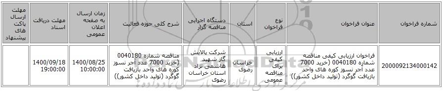 2000092134000142فراخوان ارزیابی کیفی مناقصه شماره 0040180 (خرید 7000 عدد آجر نسوز کوره های واحد بازیافت گوگرد (تولید داخل کشور))ارزیابی کیفی برای مناقصه عمومیخراسان رضویشرکت پالایش گاز شهید هاشمی نژاد استان خراسان رضوی مناقصه شماره 0040180 (خرید 7000 عدد آجر نسوز کوره های واحد بازیافت گوگرد (تولید داخل کشور)) 1400/08/25 10:00:001400/09/18 19:00:00