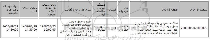 مناقصه، مناقصه عمومی یک مرحله ای خرید و حمل و پخش آسفالت 019و قیر پاشی بلوار اصلی محله سید جمال الدین و خیابان اصلی ده قدیم مصطفی اباد , مناقصه عمومی یک مرحله ای خرید و حمل و پخش آسفالت 019و قیر پاشی بلوار اصلی محله سید جمال الدین و خیابان اصلی ده قدیم مصطفی اباد