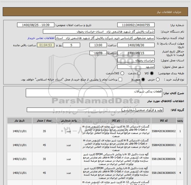 نام دستگاه خریدار:شرکت پالایش گاز شهید هاشمی نژاد استان خراسان رضوی