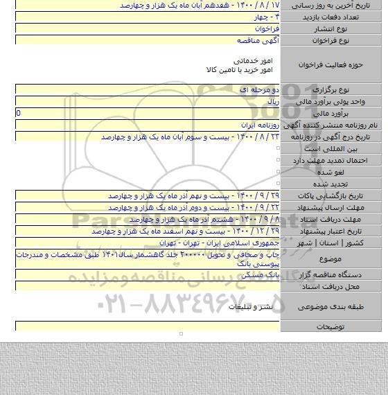 چاپ و صحافی و تحویل ۲۰۰۰۰۰ جلد گاهشمار سال۱۴۰۱ طبق مشخصات و مندرجات پیوستی بانک