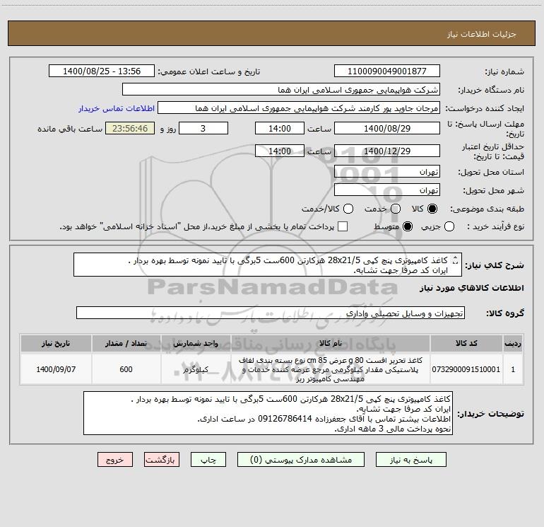 توضیحات خریدار:کاغذ کامپیوتری پنچ کپی 28x21/5 هرکارتن 600ست 5برگی با تایید نمونه توسط بهره بردار . ایران کد صرفا جهت تشابه. اطلاعات بیشتر تماس با آقای جعفرزاده 09126786414 در ساعت اداری. نحوه پرداخت مالی 3 ماهه اداری.