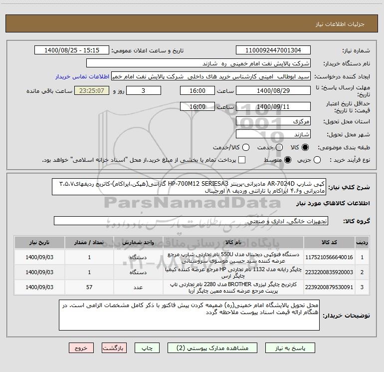 شرح کلی نیاز: کپی شارپ AR-7024D مادیرانی-پرینتر HP-700M12 SERIESA3 گارانتی(هپکن،ایراکام)-کاتریج ردیفهای۳،۵،۷ مادیرانی و۴،۶ ایراکام یا تارانتی وردیف ۸ اورجینال
