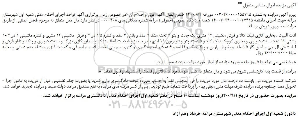 پیرو آگهی مزایده به شماره 0030460000155795 مورخه 1400/8/4 ضمن ابطال آگهی فوق و اصلاح آن (در خصوص زمان برگزاری آگهی)واحد اجرای احکام مدنی شعبه اول شهرستان مراغه جهت اجرای دادنامه 140030390001027415 شعبه 1 دادگاه عمومی (حقوقی) مراغه شماره بایگانی های 0000408 در نظر دارد مال ذیل متعلق به مرحوم فاضل ایمانی از طریق مزایده حضوری بفروش برساند: