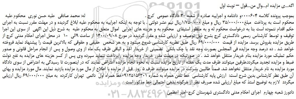 بموجب پرونده کلاسه 0000604و دادنامه و اجراییه صادره از شعبه 30 دادگاه عمومی کرج . له: محمد صادقی علیه حسن نوری محکوم علیه محکوم است به پرداخت مبلغ35/000/000 ریال و مبلغ 1/750/000ریال نیم عشر دولتی . با توجه به اینکه اجراییه به محکوم علیه ابلاغ گردیده و در مهلت مقرر نسبت به اجرای حکم اقدام ننموده است بنا به درخواست محکوم له و به منظور استیفای محکوم به و هزینه های اجرایی اموال متعلق به محکوم علیه به شرح ذیل این اگهی از سوی این اجرا توقیف و توسط کارشناس رسمی دادگستری کرج بشرح ذیل توصیف و ارزیابی شده و مقرر گردیده در مورخ 1400/09/08 از ساعت 9الی 10 در محل اجرای احکام مدنی کرج از طریق مزایده بفروش برسد. مزایده از قیمت 69/000/000 ریال طبق نظریه کارشناسی شروع میشود و به هر شخص حقیقی و حقوقی که بالاترین قیمت را پیشنهاد نماید فروخته خواهد شد . ده درصد وجه مزایده فی المجلس بصورت وجه نقد یا چک بانکی تضمینی از خریدار اخذ و الباقی ظرف یک ماه از وی وصول و پس از انجام مراحل قانونی و صدور حکم تملیک مورد مزایده بنام خریدار منتقل خواهد شد . در صورتیکه در مهلت مقرر خریدار وجه مزایده راپرداخت ننماید سپرده وی پس از کسر هزینه های مزایده به نفع دولت ضبط و مزایده تجدید میگردد.طرفین میتوانند ظرف مدت یک هفته از تاریخ مزایده نسبت به نحوه انجام مزایده اعتراض نمایند که در اینصورت تا رسیدگی به اعتراض از سوی دادگاه مورد مزایده به نام خریدار منتقل نخواهد شد. ضمناً طالبین بشرکت در مزایده میتوانند ظرف 5 روز قبل از مزایده با اطلاع از مال مورد مزایده بازدید نمایند. مال مورد مزایده و بهای آن طبق نظر کارشناس بدین شرح است: ارزش پایه کارشناسی خط تلفن همراه به شماره 09125156301خط همراه اول دائمی تهران کارکرده به مبلغ 69/000/000 ریال ارزیابی میگردد لازم به توضیح استذ که مبلغ ارزیابی شده صررف نظر از هرگونه بدهی احتمالی خط مذکور است