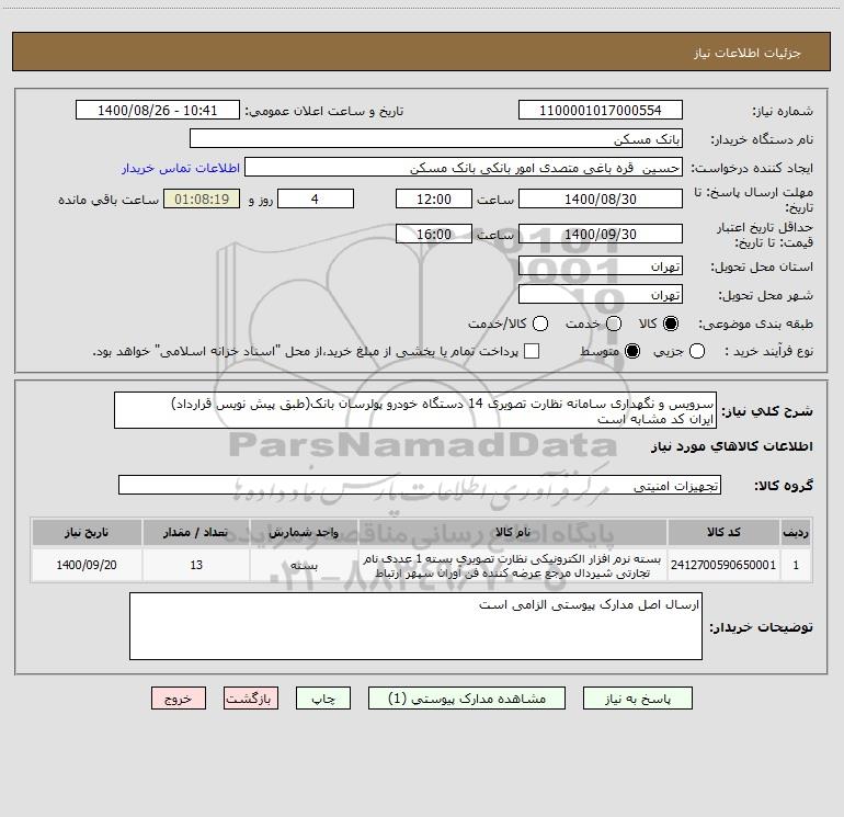 شرح کلی نیاز: سرویس و نگهداری سامانه نظارت تصویری 14 دستگاه خودرو پولرسان بانک(طبق پیش نویس قرارداد)