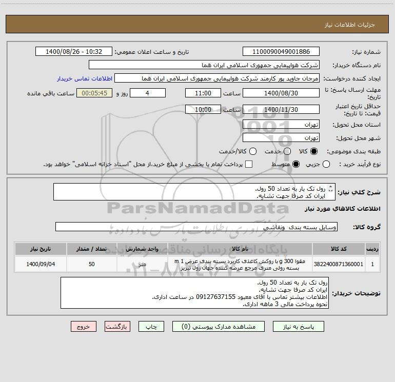شرح کلی نیاز: رول تک بار به تعداد 50 رول.