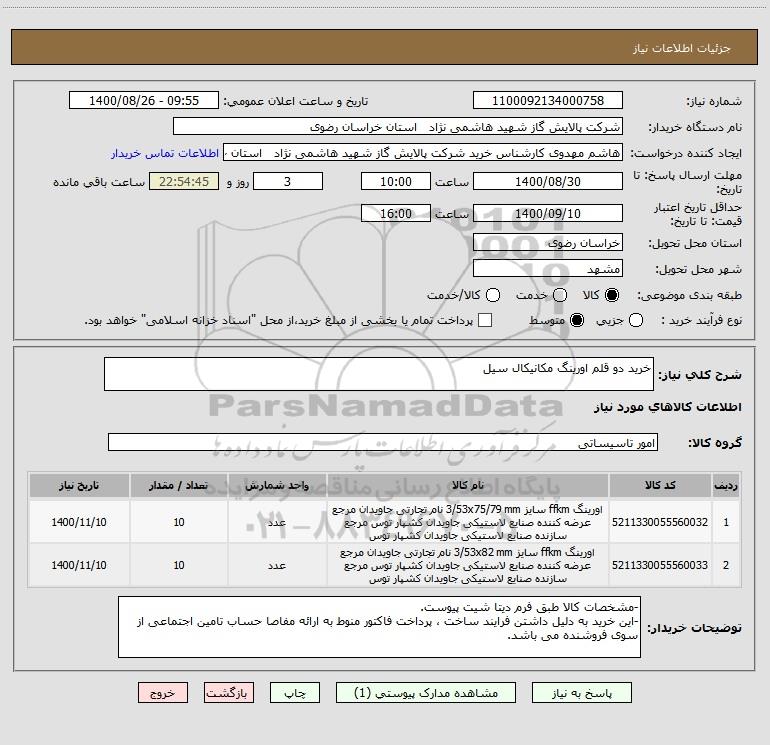 استعلام خرید دو قلم اورینگ مکانیکال سیل, استعلام خرید دو قلم اورینگ مکانیکال سیل