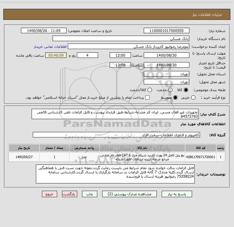 استعلام بها و موضوع استعلام استعلام تجهیزات غیر فعال مسی. ایران کد مشابه.شرایط طبق قرارداد پیوست و فایل الزامات تلفن کارشناس قائمی 64572763 به اطلاع کلیه شرکت‌ها و افراد متخصص واجد شرایط می‌رساند، آگهی گذار در نظر دارد از طریق استعلام بها، نسبت به انتخاب و دریافت پیشنهادات اقدام نماید. این استعلام با کد آگهی ثبت شده در سامانه خبرگزاری پارس نماد : 3963357 منتشر شده است. مشخصات استعلام : تاریخ شروع استعلام: 1400/08/26 آخرین مهلت ارسال پیشنهاد قیمت : 1400/08/30 و محل اجرای پروژه : استان تهران میباشد. استعلام قیمت مورد درخواست : استعلام تجهیزات غیر فعال مسی. ایران کد مشابه.شرایط طبق قرارداد پیوست و فایل الزامات تلفن کارشناس قائمی 64572763 با دسته‌بندی‌های تخصصی و گروه های مرتبط : سیم و کابل, کامپیوتر, اینترنت شبکه, تجهیزات مخابرات, استعلام اطلاع رسانی میگردد. شرایط شرکت در استعلام آنلاین : ابتدا ثبت نام در سامانه استعلام پارس نماد و تکمیل مدارک موردنیاز و بارگذاری در سامانه رعایت تمامی ضوابط و الزامات مندرج در اسناد استعلام است.