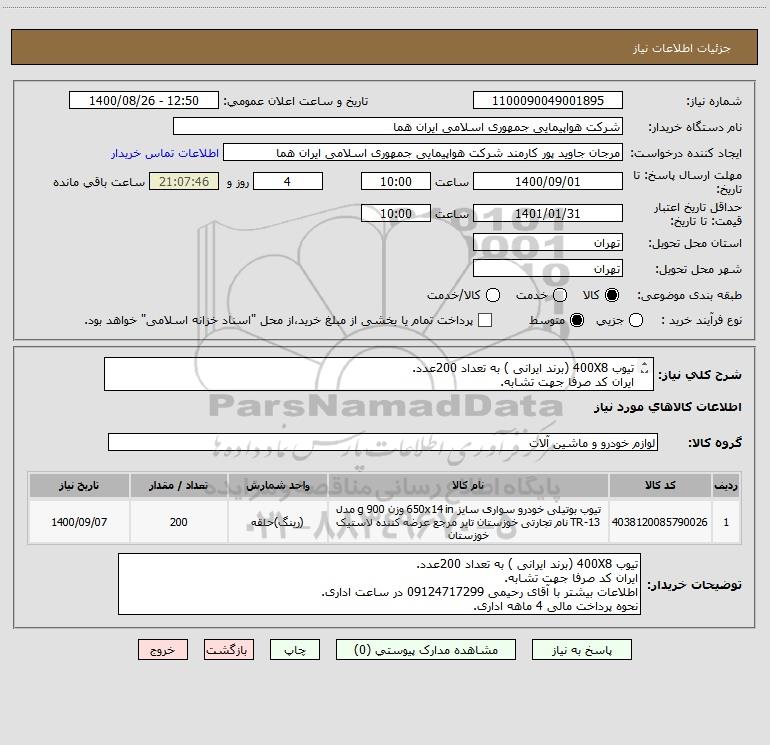 شرح کلی نیاز: تیوب 400X8 (برند ایرانی ) به تعداد 200عدد.