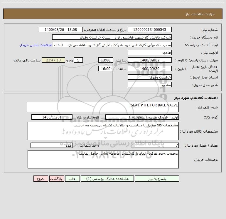 نام دستگاه خریدار:شرکت پالایش گاز شهید هاشمی نژاد استان خراسان رضوی