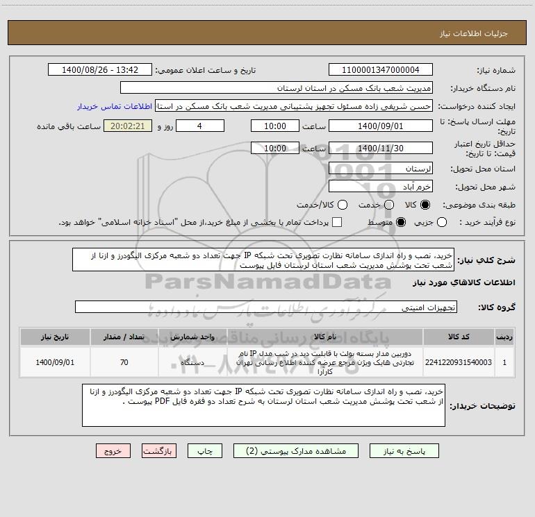 شرح کلی نیاز: خرید، نصب و راه اندازی سامانه نظارت تصویری تحت شبکه IP جهت تعداد دو شعبه مرکزی الیگودرز و ازنا از شعب تحت پوشش مدیریت شعب استان لرستان فایل پیوست