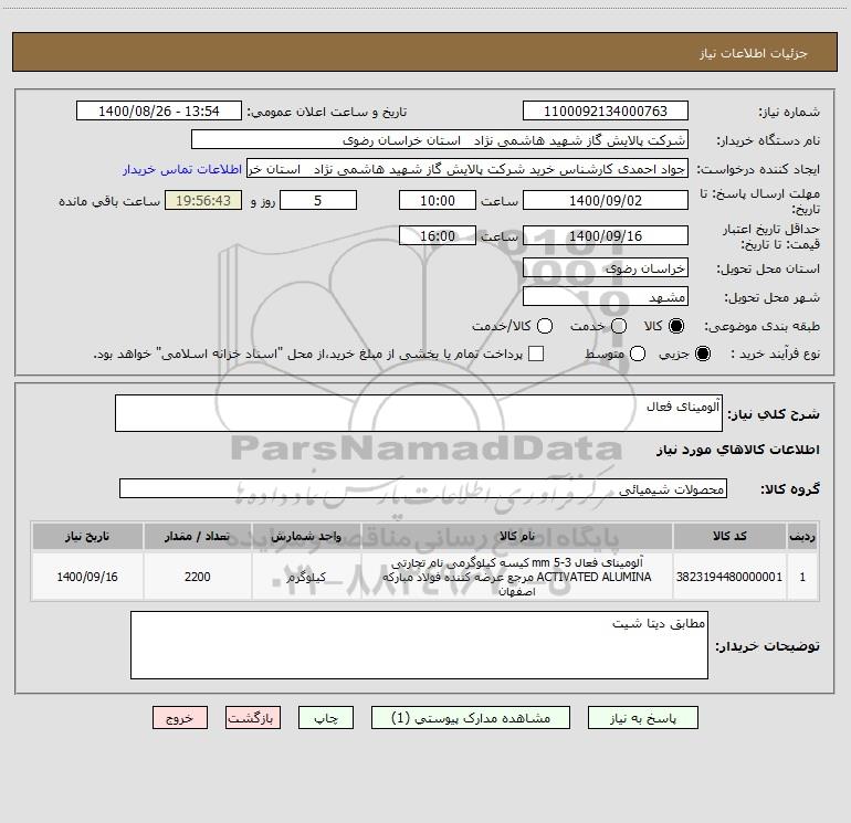 نام دستگاه خریدار:شرکت پالایش گاز شهید هاشمی نژاد استان خراسان رضوی