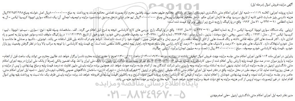 شماره پرونده اجرایی: کلاسه 0001119شعبه اول اجرای احکام مدنی دادگستری شهرستان اردبیل در راستای محکوم علیهم محمد سپوند وافشین محرم نژاد بصورت تضامنی محکوم هستند به پرداخت به مبلغ800/000/000ریال اصل خواسته ومبلغ27/952/998ریال هزینه دادرسی ونیز خسارت تاخیر تادیه از تاریخ سررسید چک ها تازمان اجرای حکم درحق محکوم له سهراب پورعالی ومبلغ 40/000/000ریال نیم عشر دولتی درحق صندوق دولت،مورد مزایده و توصیف اجمالی آن: یک دستگاه سواری تویوتا کریسیدا ایکس - ال به شماره انتظامی 91 – 247 ب 71 مدل 1992 واقع در پارکینگ زارع،به شرح زیر ارزیابی و برآورد قیمت شده است؛
