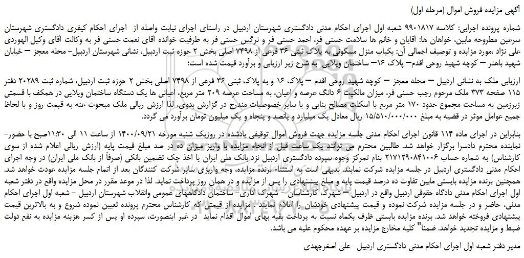 شماره پرونده اجرایی: کلاسه 9901817 شعبه اول اجرای احکام مدنی دادگستری شهرستان اردبیل در راستای اجرای نیابت واصله از اجرای احکام کیفری دادگستری شهرستان سرعین مطروحه مابین، خواهان ها: آقایان و خانم ها سلامت حسنی فر، احمد حسنی فر و نرگس حسنی فر به طرفیت خوانده آقای نعمت حسنی فر به وکالت آقای وکیل الهوردی علی نژاد ،مورد مزایده و توصیف اجمالی آن: یکباب منزل مسکونی به پلاک ثبتی 36 فرعی از 7498 اصلی بخش 2 حوزه ثبت اردبیل، نشانی شهرستان اردبیل- محله معجز – خیابان شهید باهنر – کوچه شهید روحی اقدم– پلاک 16– ساختمان ویلایی به شرح زیر ارزیابی و برآورد قیمت شده است؛