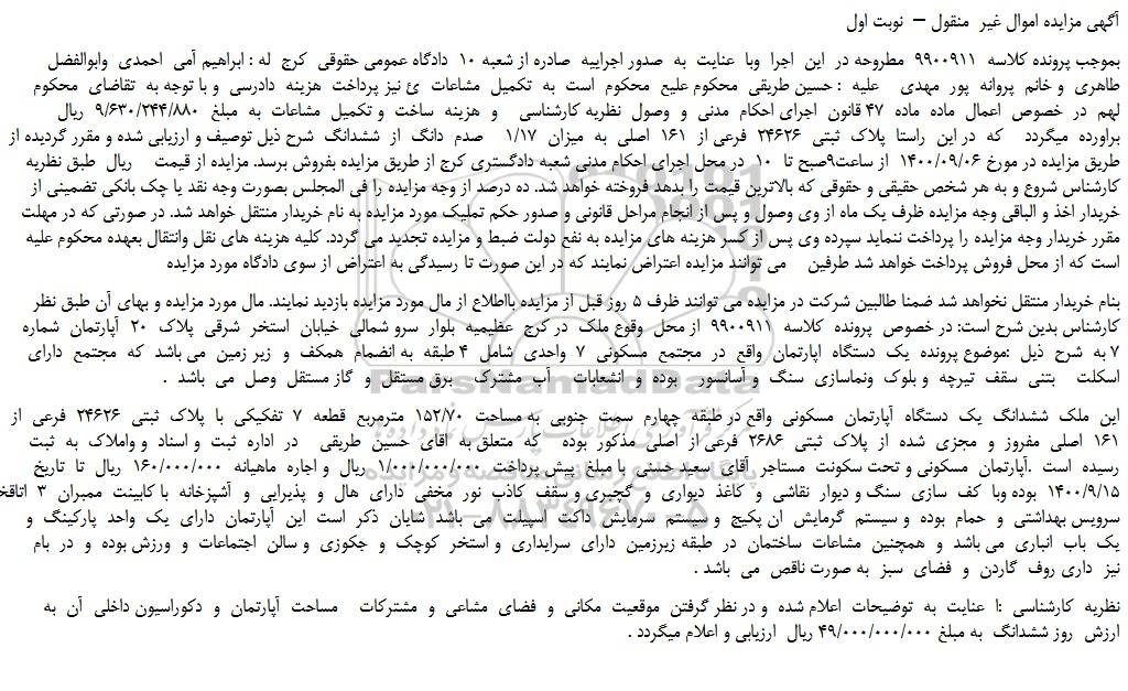 بموجب پرونده کلاسه 9900911 مطروحه در این اجرا وبا عنایت به صدور اجراییه صادره از شعبه 10 دادگاه عمومی حقوقی کرج له : ابراهیم آمی احمدی وابوالفضل طاهری و خانم پروانه پور مهدی علیه : حسین طریقی محکوم علیع محکوم است به تکمیل مشاعات ئ نیز پرداخت هزینه دادرسی و با توجه به تقاضای محکوم لهم در خصوص اعمال ماده ماده 47 قانون اجرای احکام مدنی و وصول نظریه کارشناسی و هزینه ساخت و تکمیل مشاعات به مبلغ 9/630/244/880 ریال براورده میگردد که در این راستا پلاک ثبتی 24626 فرعی از 161 اصلی به میزان 1/17 صدم دانگ از ششدانگ شرح ذیل توصیف و ارزیابی شده و مقرر گردیده از طریق مزایده در مورخ 1400/09/06 از ساعت9صبح تا 10 در محل اجرای احکام مدنی شعبه دادگستری کرج از طریق مزایده بفروش برسد. مزایده از قیمت ریال طبق نظریه کارشناس شروع و به هر شخص حقیقی و حقوقی که بالاترین قیمت را بدهد فروخته خواهد شد. ده درصد از وجه مزایده را فی المجلس بصورت وجه نقد یا چک بانکی تضمینی از خریدار اخذ و الباقی وجه مزایده ظرف یک ماه از وی وصول و پس از انجام مراحل قانونی و صدور حکم تملیک مورد مزایده به نام خریدار منتقل خواهد شد. در صورتی که در مهلت مقرر خریدار وجه مزایده را پرداخت ننماید سپرده وی پس از کسر هزینه های مزایده به نفع دولت ضبط و مزایده تجدید می گردد. کلیه هزینه های نقل وانتقال بعهده محکوم علیه است که از محل فروش پرداخت خواهد شد طرفین می توانند مزایده اعتراض نمایند که در این صورت تا رسیدگی به اعتراض از سوی دادگاه مورد مزایده
