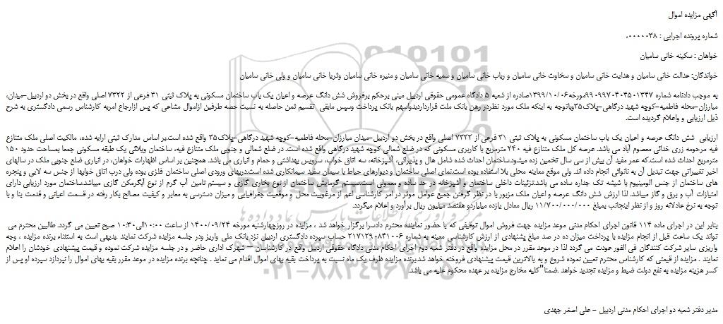 ،به موجب دادنامه شماره 9909970404501347مورخه1399/10/06صادره از شعبه 5 دادگاه عمومی حقوقی اردبیل مبنی برحکم برفروش شش دانگ عرصه و اعیان یک باب ساختمان مسکونی به پلاک ثبتی 31 فرعی از 7322 اصلی واقع در بخش دو اردبیل-میدان مبارزان-محله فاطمیه-کوچه شهید درگاهی-پلاک35وباتوجه به اینکه ملک مورد نظردر رهن بانک ملت قرارداردبدواسهم بانک پرداخت وسپس مابقی تقسیم ثمن حاصله به نسبت حصه طرفین ازاموال مشاعی که پس ازارجاع امربه کارشناس رسمی دادگستری به شرح ذیل ارزیابی و واعلام گردیده است.