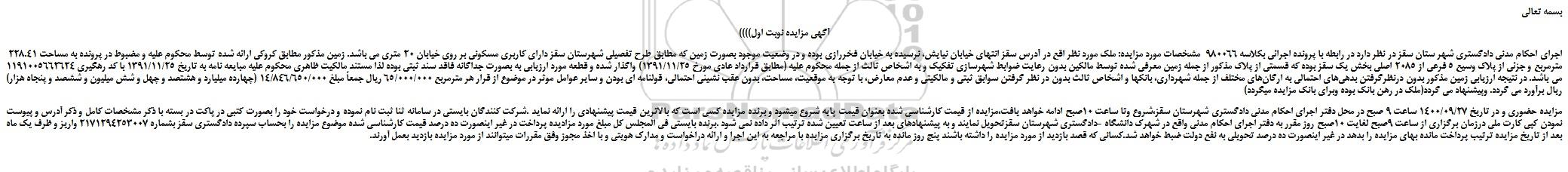 اجرای احکام مدنی دادگستری شهر ستان سقز در نظر دارد در رابطه با پرونده اجرائی بکلاسه 980066 مشخصات مورد مزایده: ملک مورد نظر اقع در آدرس سقز انتهای خیابان نیایش، نرسیده به خیابان فخررازی بوده و در وضعیت موجود بصورت زمین که مطابق طرح تفصیلی شهرستان سقز دارای کاربری مسکونی بر روی خیابان 20 متری می باشد. زمین مذکور مطابق کروکی ارائه شده توسط محکوم علیه و مضبوط در پرونده به مساحت 228.41 مترمربع و جزئی از پلاک وسیع 5 فرعی از 2085 اصلی بخش یک سقز بوده که قسمتی از پلاک مذکور از جمله زمین معرفی شده توسط مالکین بدون رعایت ضوابط شهرسازی تفکیک و به اشخاص ثالث از جمله محکوم علیه (مطابق قرارداد عادی مورخ 1391/11/25) واگذار شده و قطعه مورد ارزیابی به بصورت جداگانه فاقد سند ثبتی بوده لذا مستند مالکیت ظاهری محکوم علیه مبایعه نامه به تاریخ 1391/11/25 با کد رهگیری 1191005662624 می باشد. در نتیجه ارزیابی زمین مذکور بدون درنظرگرفتن بدهیهای احتمالی به ارگانهای مختلف از جمله شهرداری، بانکها و اشخاص ثالث بدون در نظر گرفتن سوابق ثبتی و مالکیتی و عدم معارض، با توجه به موقعیت، مساحت، بدون عقب نشینی احتمالی، قولنامه ای بودن و سایر عوامل موثر در موضوع از قرار هر مترمربع 65/000/000 ریال جمعاً مبلغ 14/846/650/000 (چهارده میلیارد و هشتصد و چهل و شش میلیون و ششصد و پنجاه هزار) ریال برآورد می گردد. وپیشنهاد می گردد(ملک در رهن بانک بوده وبرای بانک مزایده میگردد)