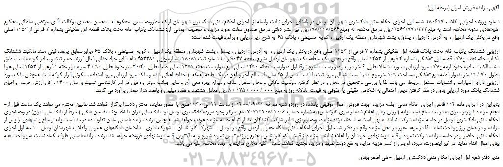 شماره پرونده اجرایی: کلاسه 980617 شعبه اول اجرای احکام مدنی دادگستری شهرستان اردبیل در راستای اجرای نیابت واصله از اجرای احکام مدنی دادگستری شهرستان اراک مطروحه مابین، محکوم له : محسن محمدی بوکالت آقای مرتضی سلطانی محکوم علیه:هادی ستونه محکوم است به مبلغ3/564/771/332ریال درحق محکوم له ومبلغ178/238/566ریال نیم عشر دولتی درحق صندوق دولت ،مورد مزایده و توصیف اجمالی آن: ششدانگ یکباب خانه تحت پلاک قطعه اول تفکیکی بشماره 2 فرعی از 1253 اصلی واقع در بخش یک اردبیل ، به آدرس : اردبیل ، یساول، پشت شهرداری منطقه یک اردبیل ، کوچه حسینعلی ، پلاک 65 به شرح زیر ارزیابی و برآورد قیمت شده است؛