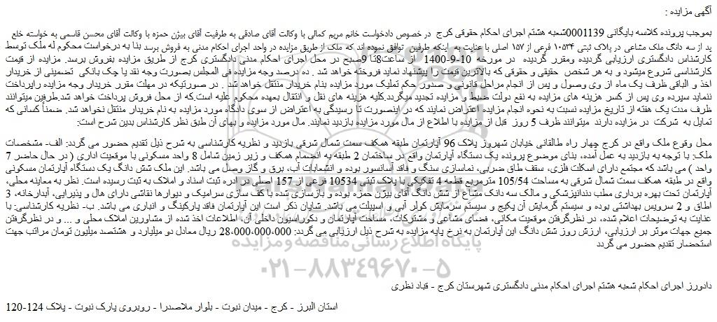 محل وقوع ملک واقع در کرج چهار راه طالقانی خیابان شهروز پلاک 96 آپارتمان طبقه همکف سمت شمال شرقی بازدید و نظریه کارشناسی به شرح ذیل تقدیم حضور می گردد: الف- مشخصات ملک: با توجه به بازدید به عمل آمده، بنای موضوع پرونده یک دستگاه آپارتمان واقع در ساختمان 2 طبقه به انضمام همکف و زیر زمین شامل 8 واحد مسکونی با موقعیت اداری ( در حال حاضر 7 واحد ) می باشد که مجتمع دارای اسکلت فلزی، سقف طاق ضربی، نماسازی سنگ و فاقد آسانسور بوده و انشعابات آب، برق و گاز وصل می باشد. این ملک شش دانگ یک دستگاه آپارتمان مسکونی واقع در طبقه همکف سمت شمال شرقی به مساحت 105/54 مترمربع قطعه 4 تفکیکی با پلاک ثبتی 10534 فرعی از 157 اصلی در ادره ثبت اسناد و املاک به ثبت رسیده است. نظر به معاینه محلی، آپارتمان تحت بهره برداری مطب دندانپزشکی و مالک سه دانک مشاع از شش دانگ آقای بیژن حمزه بوده و بازسازی شده با کف سازی سرامیک و دیوارها نقاشی دارای هال و پذیرایی، آبدارخانه، 3 اطاق و 2 سرویس بهداشتی بوده و سیستم گرمایش آن پکیج و سیستم سرمایش کولر آبی و اسپیلت می باشد. شایان ذکر است این آپارتمان فاقد پارکینگ و انباری می باشد. ب- نظریه کارشناسی: با عنایت به توضیحات اعلام شده، در نظرگرفتن موقعیت مکانی، فضای مشاعی و مشترکات، مساحت آپارتمان و دکوراسیون داخلی آن، اطلاعات اخذ شده از مشاورین املاک محلی و ... و در نظرگرفتن جمیع جهات موثر بر ارزیابی، ارزش روز شش دانگ این آپارتمان به نرخ پایه مزایده به شرح ذیل ارزیابی می گردد: 28،000،000،000 ریال معادل دو میلیارد و هشتصد میلیون تومان مراتب جهت استحضار تقدیم حضور می گردد