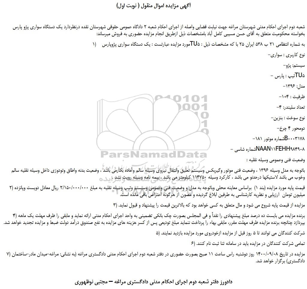 شعبه دوم اجرای احکام مدنی شهرستان مراغه جهت نیابت قضایی واصله از اجرای احکام شعبه 2 دادگاه عمومی حقوقی شهرستان نقده درنظردارد یک دستگاه سواری پژو پارس بخواسته محکومیت متعلق به آقای حسن مسیبی کامل آباد بامشخصات ذیل ازطریق انجام مزایده حضوری به فروش میرساند: