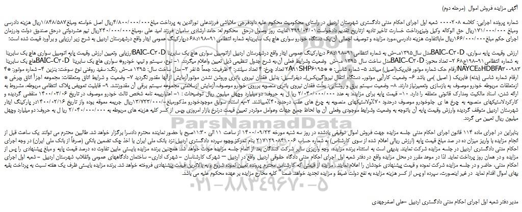 ارزیابی وتعیین ارزش وقیمت پایهِ اتومبیل سواری هاچ بک سابرینا BAIC-C30Dمدل سال1395هـ-ش به شماره انتظامی91-198د68 درپارکینگ عمومی ایثار واقع درشهرستان اردبیل ازاتومبیل سواری هاچ بک سابرینا BAIC-C30D ،ارزش وقیمت پایه سواری هاچ بک سابرینا BAIC-C30D مدل ساخت سال 1395 هـ-ش وضعیت وشرایط فعلی آن،به شرح جدول تنظیمی ذیل تعیین واعلام میگردد. 1- نوع، سیستم و تیپ خودرو* سواری هاچ بک سابرینا BAIC-C30D به شماره انتظامی91-198ج68 2- تعداد محور: 2 تعداد چرخ: 4 تعداد سیلندر: 4 ظرفیت: جمعاً 5 نفر 3- مدل ساخت سال: 1395 هـ-ش رنگ: سفید روغنی نوع سوخت: بنزین 4- شماره موتور: *4A91SHP6195* ارقام حک شماره موتور فابریک(اصیل) میباشد 5- شماره شاسی: *NAYCE5HDBFA300983 * ارقام شماره شاسی (بدنه) فابریک ( اصیل )می باشد 6- وضعیت کارآیی موتورـ دستگاه انتقال نیرو(گیربکس)ـ دیفرانسیل: بدلیل فقدان نیروی باتری وروشن نشدن موتورآزمایش ازآنها مقدور نگردید 7- وضعیت و شرایط اتاق ومتعلقات: مجموعه اجزأ اتاق وبرخی ازمتعلقات مربوطه خودرو موصوف به بازسازی وتعمیرنیاز دارند. 8- وضعیت سیستم برق و روشنایی: بعلّت فقدان نیروی باتری منصوبه برروی خودرو موصوف،آزمایش ازسلامتی مجموعه سیستم برقی آن مقدورنشد. 9- قابلیت تعویض پلاک انتظامی مربوطه، مشروط به ارائه شدن، اسناد مالکیت ومدارک قانونی متعلقه را دارد. 10- قیمت پایه برای مزایده: به عدد 2/040/000/000 ریا ل به حروف: دو میلیارد وچهل میلیون ریال توضیحات : 1- اعتباربیمه نامه شخص ثالث خودرو موصوف در تاریخ 1400/03/06 منقضی گردیده و کارکردلاستیکهای منصوبه به چرخ ها ی جلوخودرو موصوف درحدود 70%ولاستیکهای منصوبه به چرخ های عقب درحدود40%میباشند. 2-به استناد سوابق موجودخودرو مذکورمبلغ-/13/723/000ریال جریمه معوقه بوده واز تاریخ 1400/02/16در پارکینگ ایثار شهرستان اردبیل متوقف گردیده وارزش وقیمت پایه آن باتوجه به وضعیت وشرایط موجودی وفعلی آن وبا لحاظ جمیع جهات وعوامل موثردر تعیین قیمت درنرخ بازار امروزی وپس از کسر کلیه هزینه های مربوطه به 2/040/000/000 ریا ل به حروف: دو میلیارد وچهل میلیون ریال تعیین می گردد.