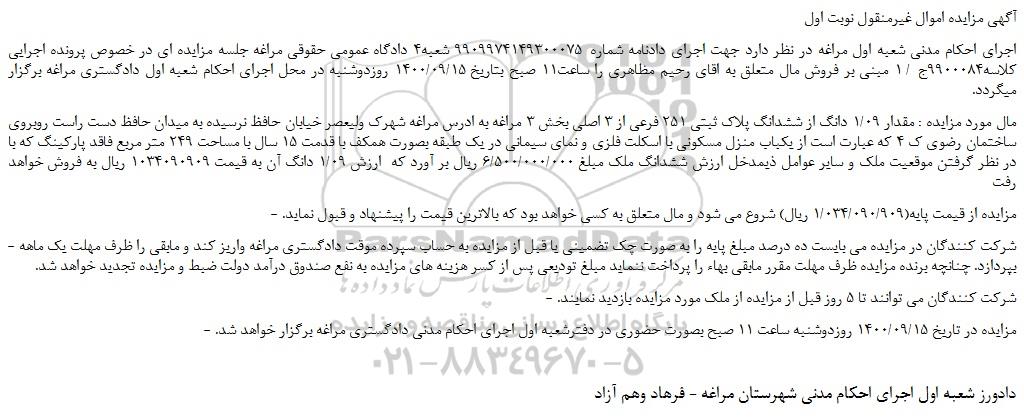 - مزایده در تاریخ 1400/09/15 روزدوشنبه ساعت 11 صبح بصورت حضوری در دفترشعبه اول اجرای احکام مدنی دادگستری مراغه برگزار خواهد شد.