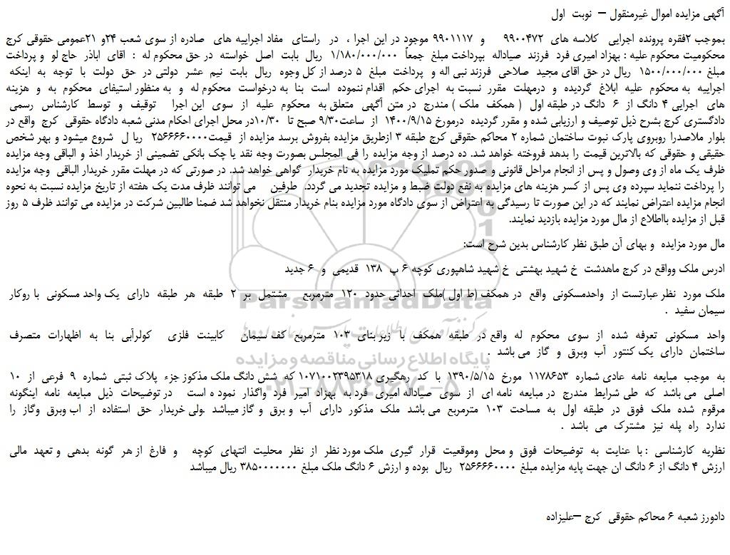 بموجب 2فقره پرونده اجرایی  کلاسه های  9900472    و  9901117 موجود در این اجرا ،  در  راستای  مفاد اجراییه های  صادره از سوی شعب 24و 21عمومی حقوقی کرج محکومیت محکوم علیه : بهزاد امیری فرد  فرزند  صیاداله  بپرداخت مبلغ  جمعاً  1/180/000/000  ریال  بابت  اصل  خواسته  در حق محکوم له  :  اقای  اباذر  حاج لو  و پرداخت مبلغ 1500/000/000  ریال در حق اقای مجید  صلاحی  فرزند نبی اله و  پرداخت  مبلغ  5 درصد از کل وجوه  ریال  بابت  نیم  عشر  دولتی در  حق  دولت  با  توجه  به  اینکه  اجراییه  به محکوم  علیه  ابلاغ  گردیده  و  درمهلت  مقرر  نسبت به  اجرای حکم  اقدام ننموده  است  بنا  به درخواست  محکوم له  و  به منظور استیفای  محکوم  به  و  هزینه های  اجرایی 4 دانگ از  6  دانگ در طبقه اول  ( همکف  ملک ) مندرج  در متن آگهی  متعلق به  محکوم  علیه  از  سوی  این اجرا    توقیف  و  توسط  کارشناس  رسمی  دادگستری کرج بشرح ذیل توصیف و ارزیابی شده و مقرر گردیده  درمورخ 1400/9/15  از  ساعت9/30 صبح تا  10/30در محل اجرای احکام مدنی شعبه دادگاه حقوقی  کرج  واقع در بلوار ملاصدرا روبروی پارک نبوت ساختمان شماره 2 محاکم حقوقی کرج طبقه 3 ازطریق مزایده بفروش برسد مزایده از  قیمت2566660000  ریا ل  شروع میشود و بهر شخص حقیقی و حقوقی که بالاترین قیمت را بدهد فروخته خواهد شد. ده درصد از وجه مزایده را فی المجلس بصورت وجه نقد یا چک بانکی تضمینی از خریدار اخذ و الباقی وجه مزایده ظرف یک ماه از وی وصول و پس از انجام مراحل قانونی و صدور حکم تملیک مورد مزایده به نام خریدار  گواهی خواهد شد. در صورتی که در مهلت مقرر خریدار الباقی  وجه مزایده را پرداخت ننماید سپرده وی پس از کسر هزینه های مزایده به نفع دولت ضبط و مزایده تجدید می گردد.  طرفین    می توانند ظرف مدت یک هفته از تاریخ مزایده نسبت به نحوه انجام مزایده اعتراض نمایند که در این صورت تا رسیدگی به اعتراض از سوی دادگاه مورد مزایده بنام خریدار منتقل نخواهد شد ضمنا طالبین شرکت در مزایده می توانند ظرف 5 روز قبل از مزایده بااطلاع از مال مورد مزایده بازدید نمایند.