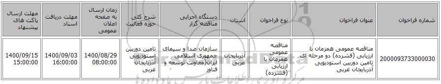 | 2000093733000030 | مناقصه عمومی همزمان با ارزیابی (فشرده) دو مرحله ای تامین دوربین استودیویی آذربایجان غربی | مناقصه عمومی همزمان با ارزیابی (فشرده) | آذربایجان غربی | سازمان صدا و سیمای جمهوری اسلامی ایران(معاونت توسعه و فناور | تامین دوربین استودیویی آذربایجان غربی | 1400/08/29 08:00:00 | 1400/09/03 16:00:00 | 1400/09/15 15:00:00 |