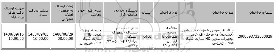 مناقصه، مناقصه عمومی همزمان با ارزیابی (فشرده) دو مرحله ای خرید تجهیزات تدوین HD سازی شبکه های تلویزیونی, مناقصه عمومی همزمان با ارزیابی (فشرده) دو مرحله ای خرید تجهیزات تدوین HD سازی شبکه های تلویزیونی