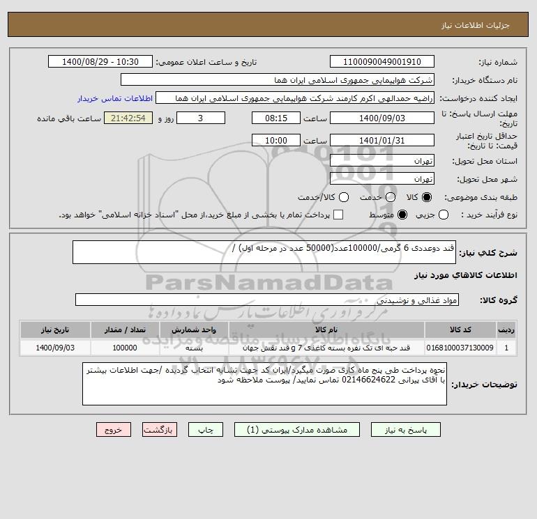 شرح کلی نیاز: قند دوعددی 6 گرمی/100000عدد(50000 عدد در مرحله اول) /