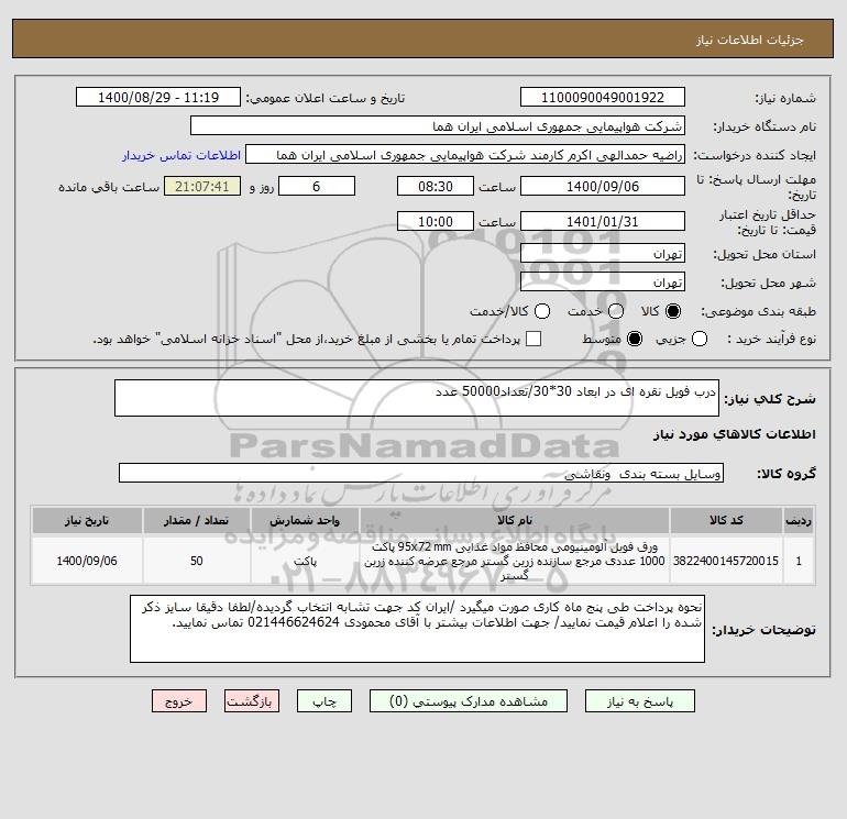 شرح کلی نیاز: درب فویل نقره ای در ابعاد 30*30/تعداد50000 عدد
